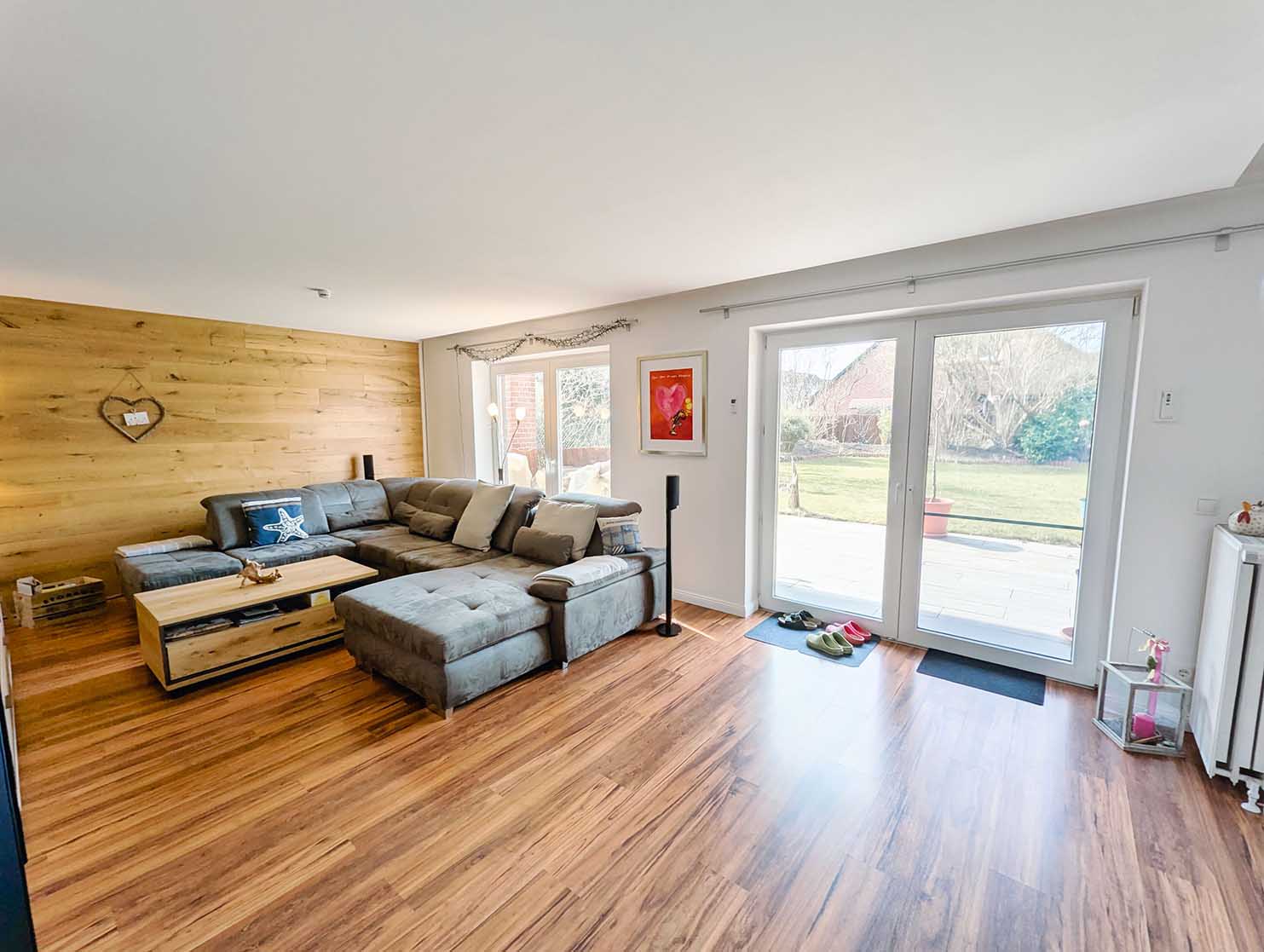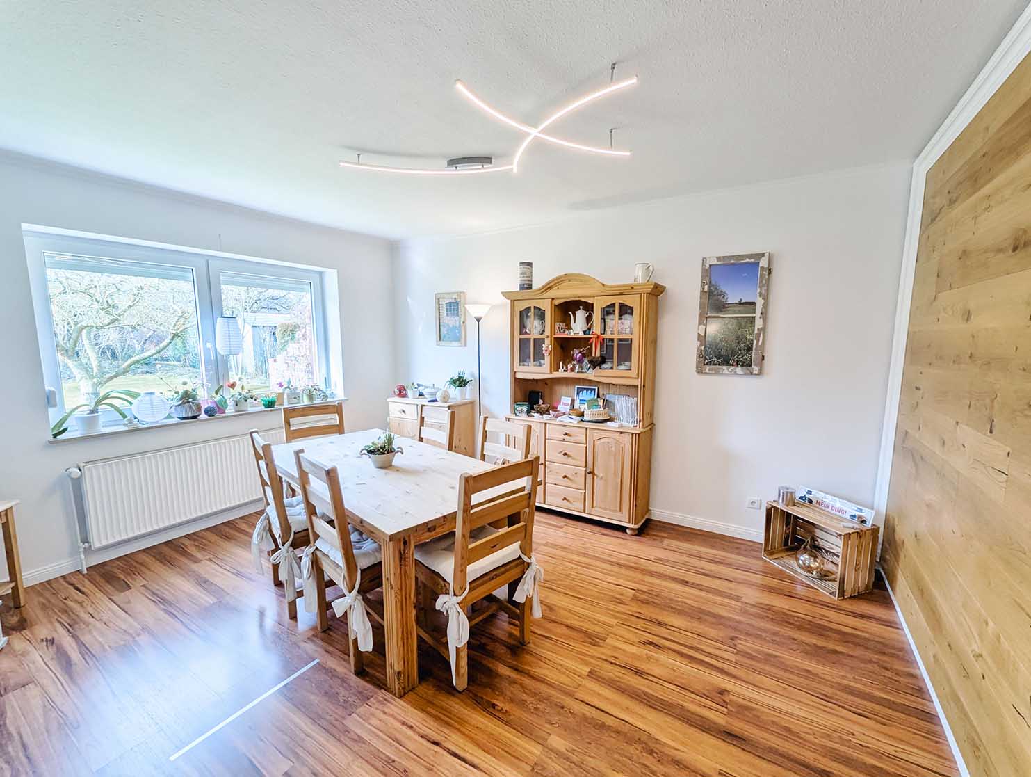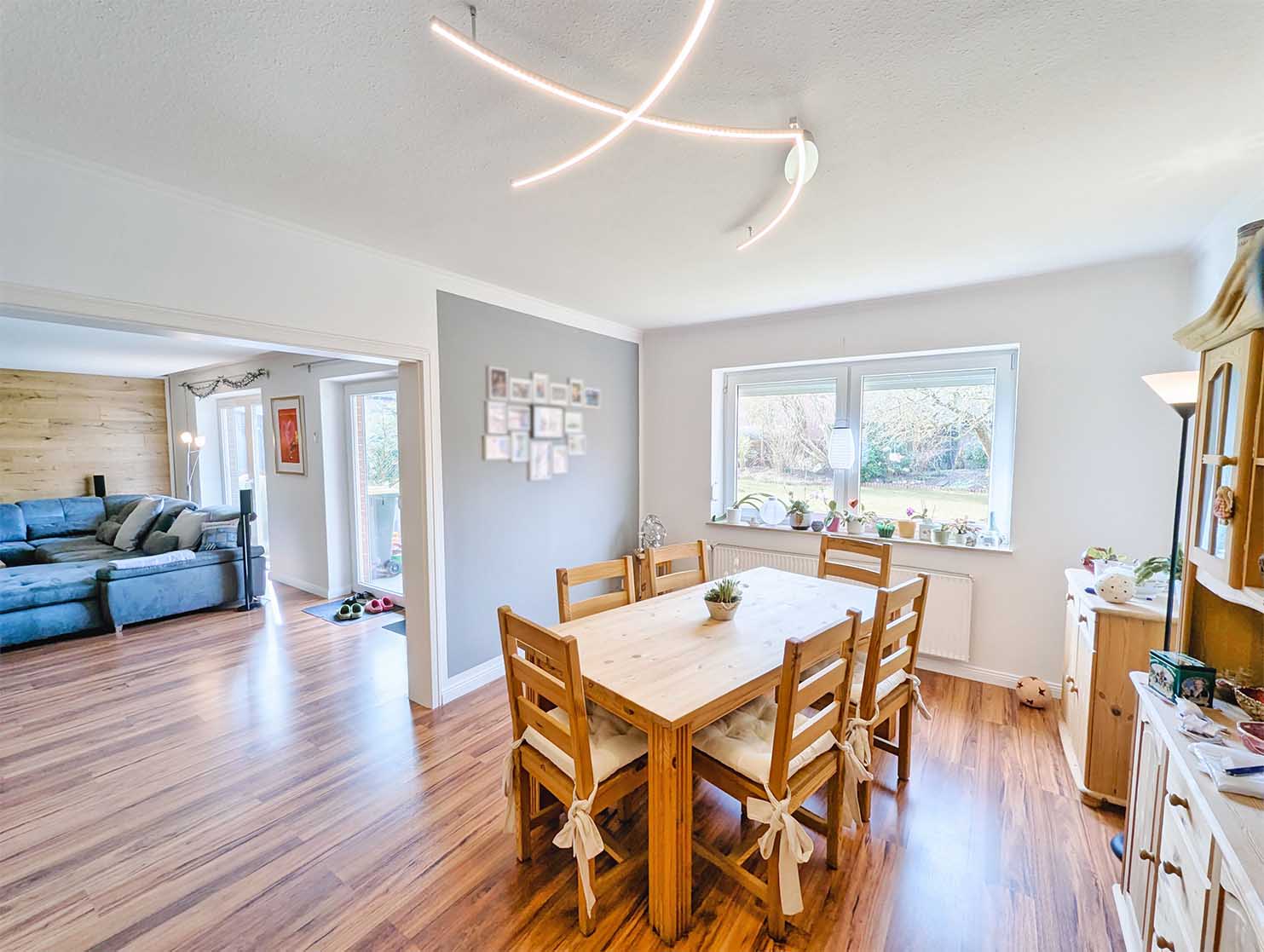 Das Haus betreten Sie über den Windfang. An diesen schließt sich die gemütliche Wohndiele an. Familienmittelpunkt bildet der stilvolle ca. 29 m2 große Wohnbereich und der offene Essbereich (ca. 15 m2).