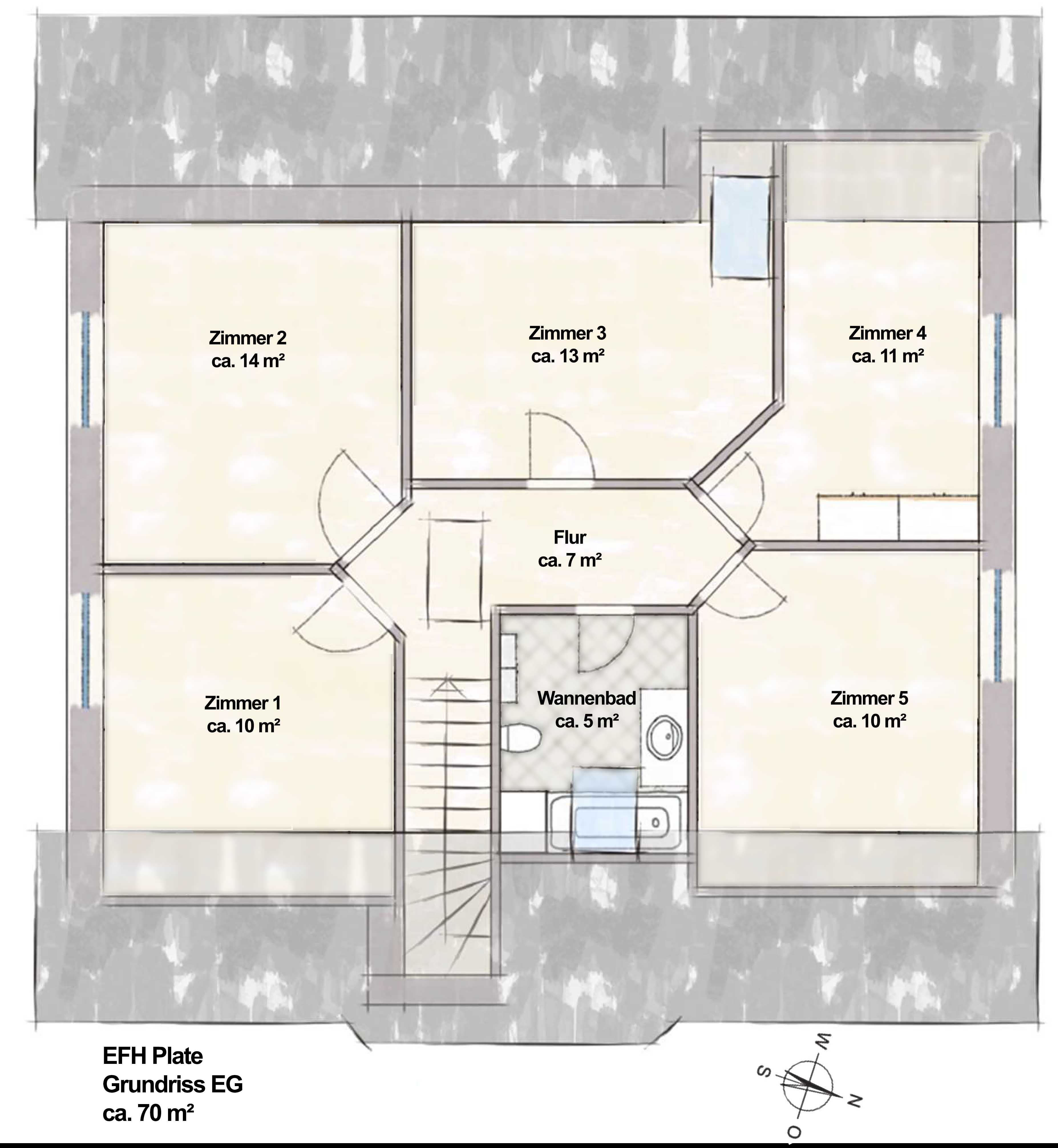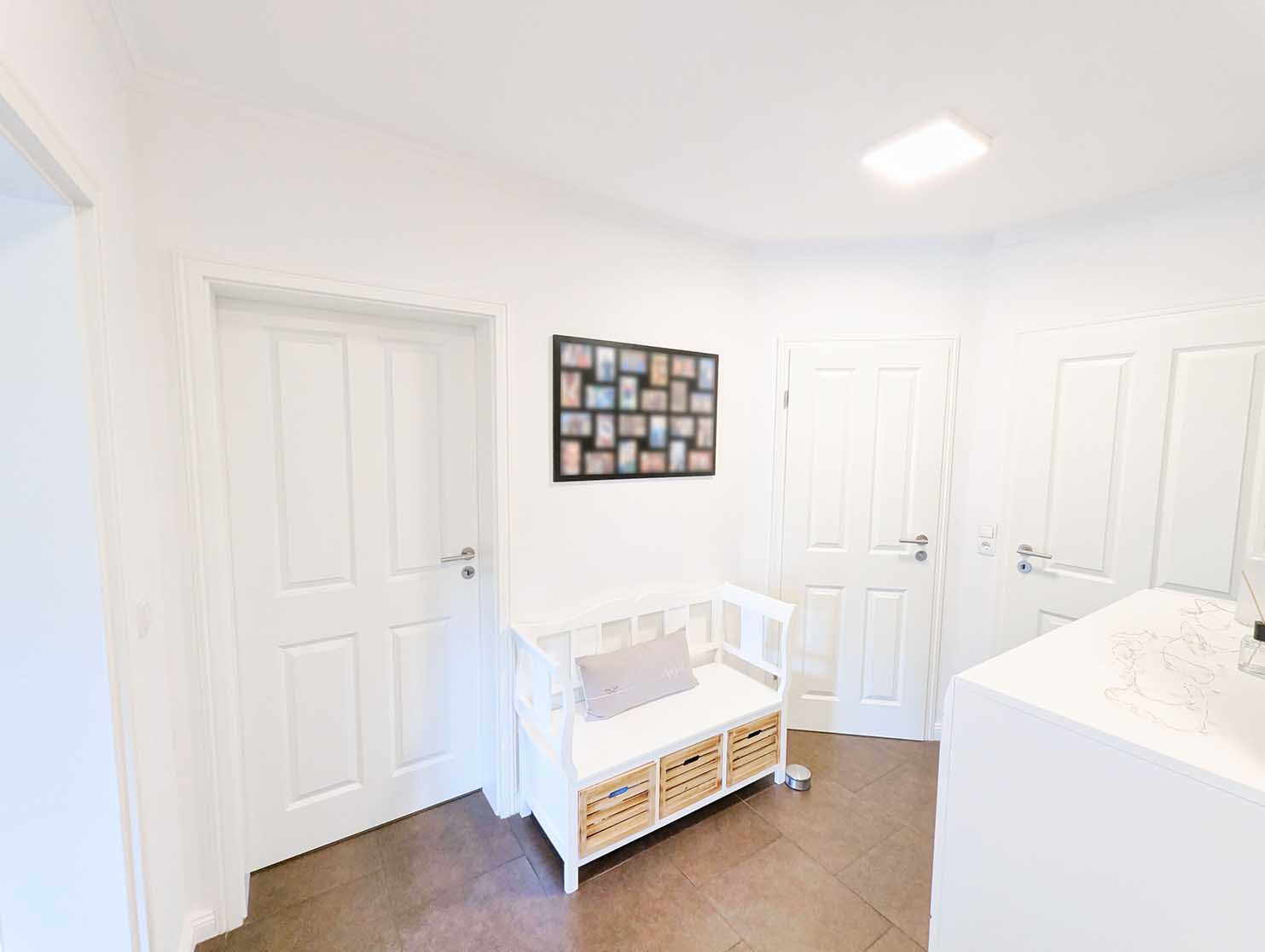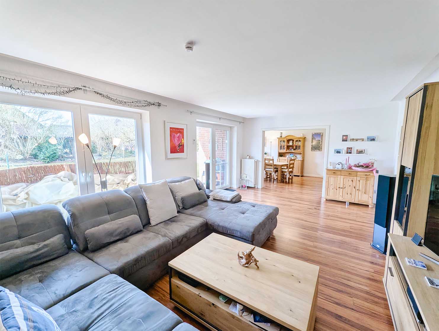 Das Haus betreten Sie über den Windfang. An diesen schließt sich die gemütliche Wohndiele an. Familienmittelpunkt bildet der stilvolle ca. 29 m2 große Wohnbereich und der offene Essbereich (ca. 15 m2).