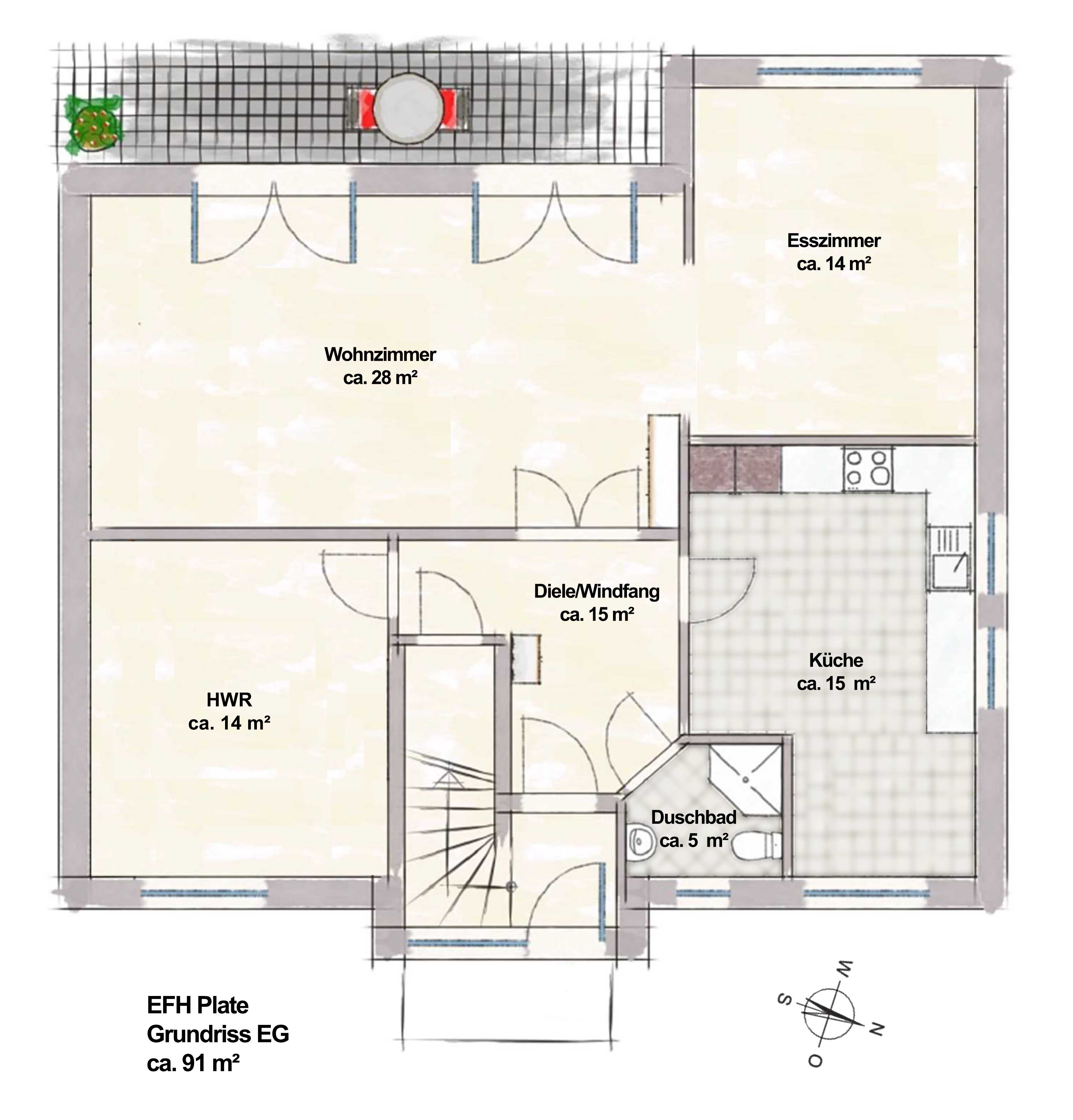 EG: Wohn-/Esszimmer, Küche, Duschbad, HWR, Diele, Terrasse