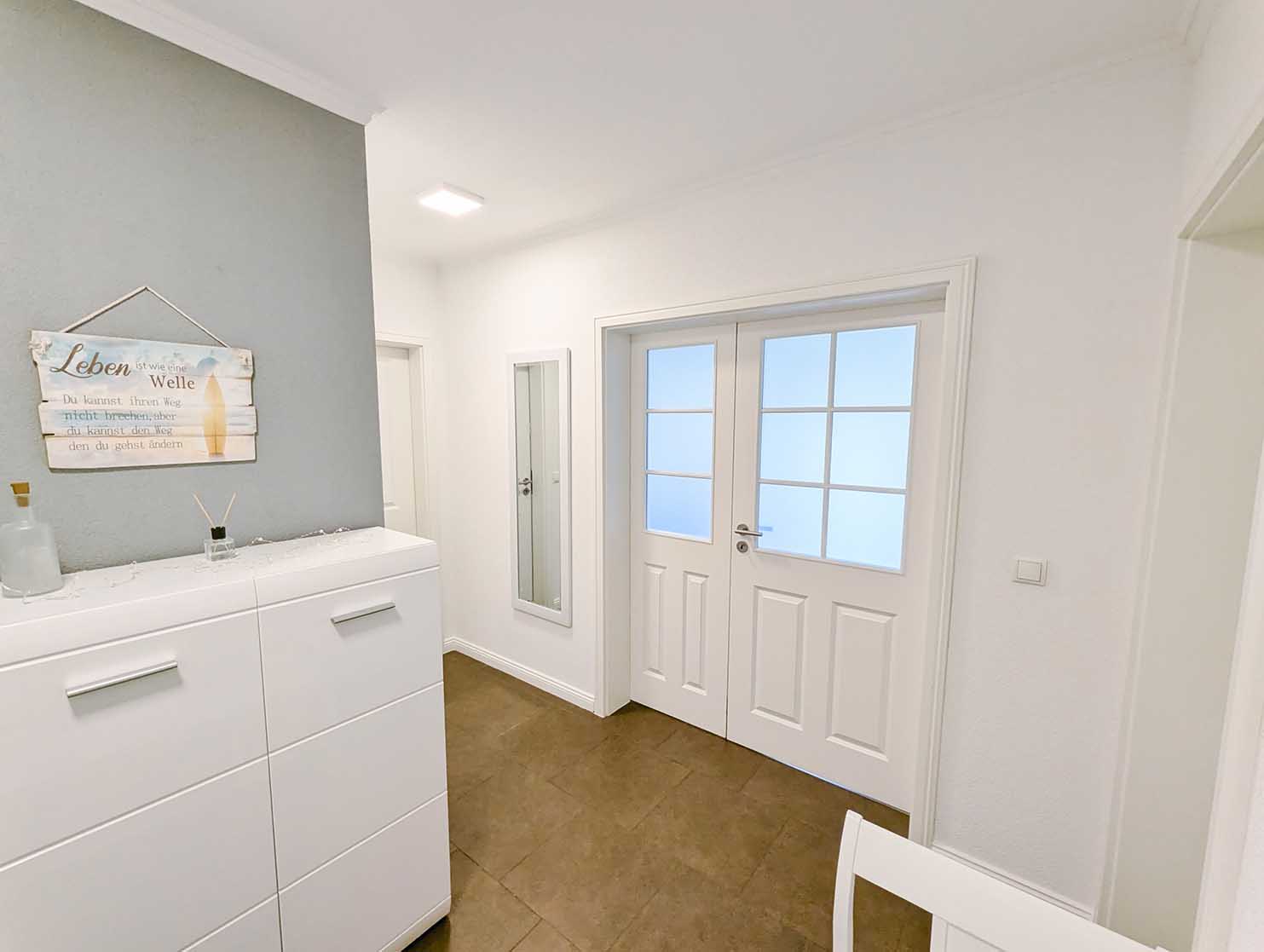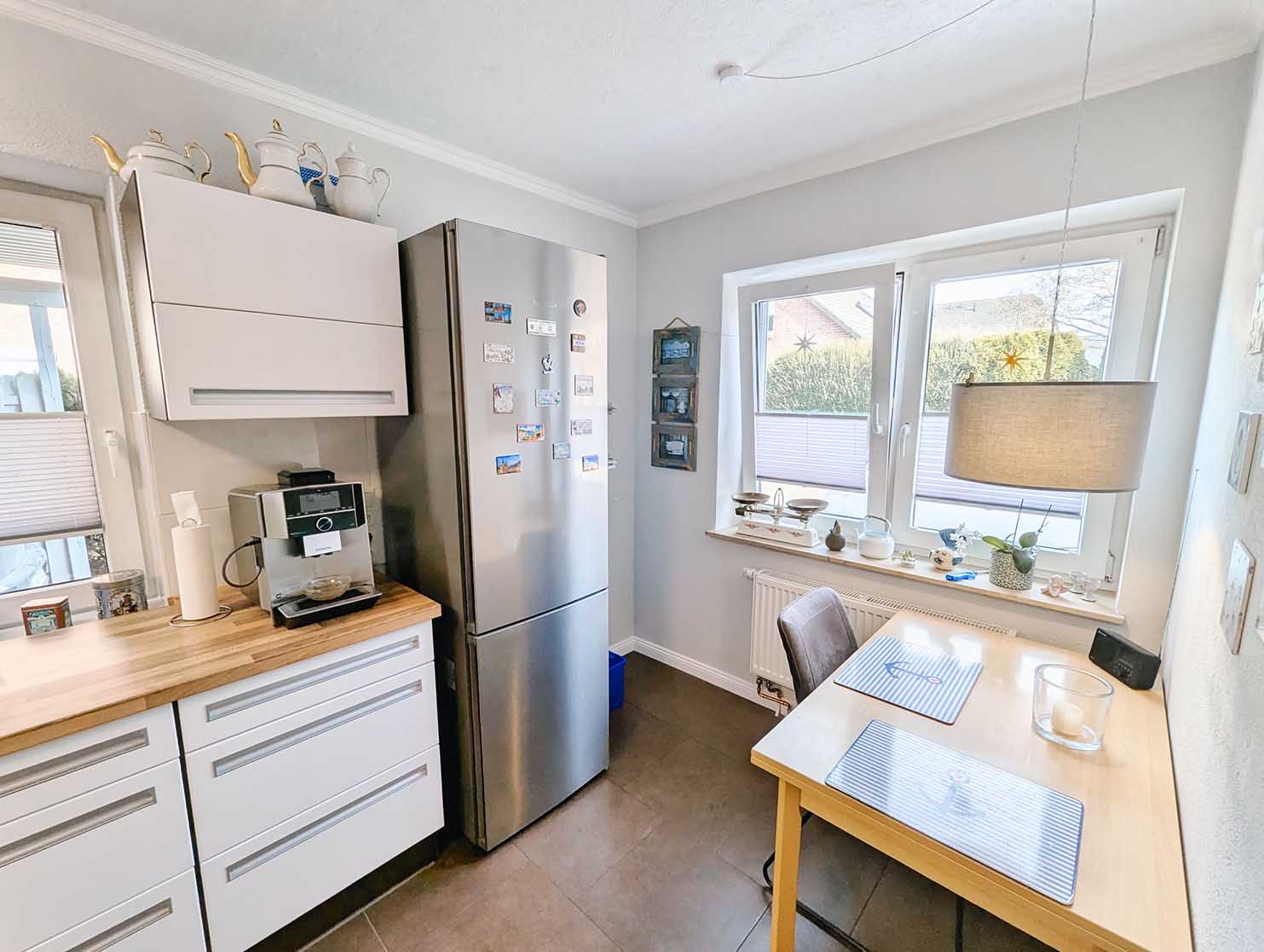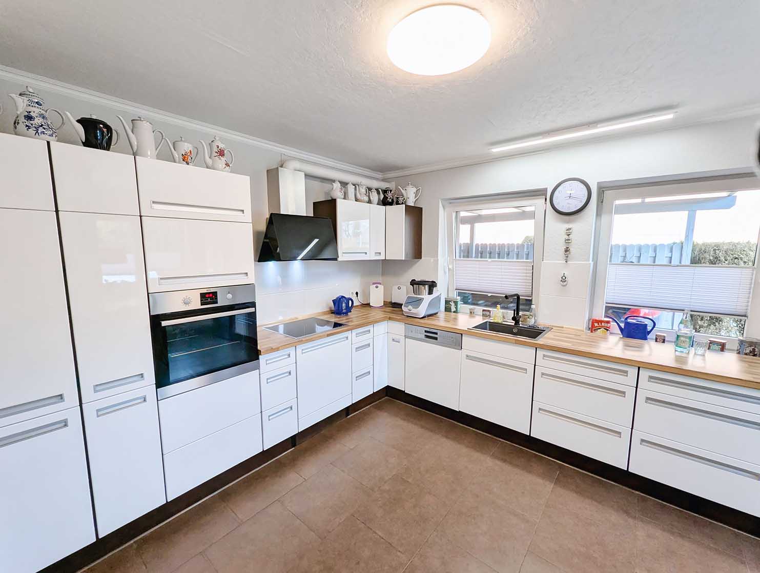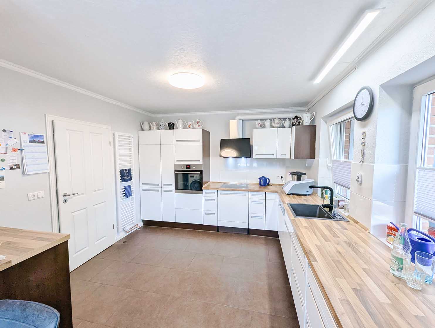 Von der Wohndiele gehen ein praktischer Hauswirtschaftsraum (15 m2), die gemütliche großzügige Wohnküche (16 m2) und das Gäste-Duschbad ab.