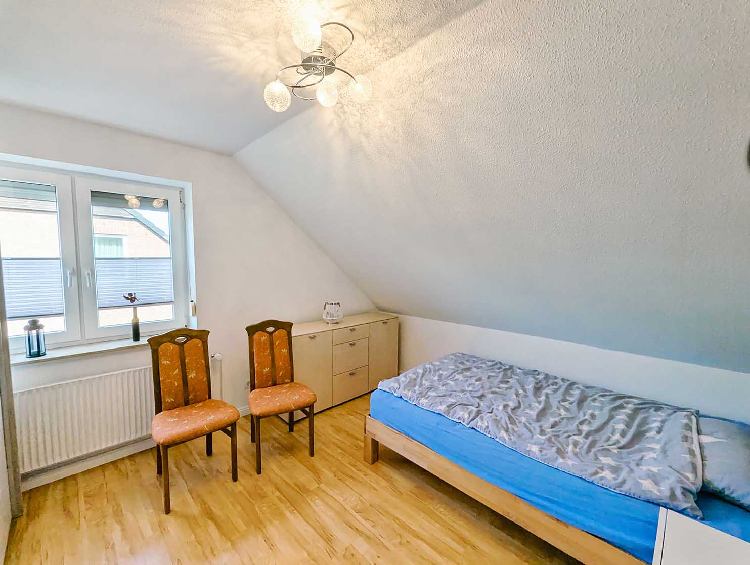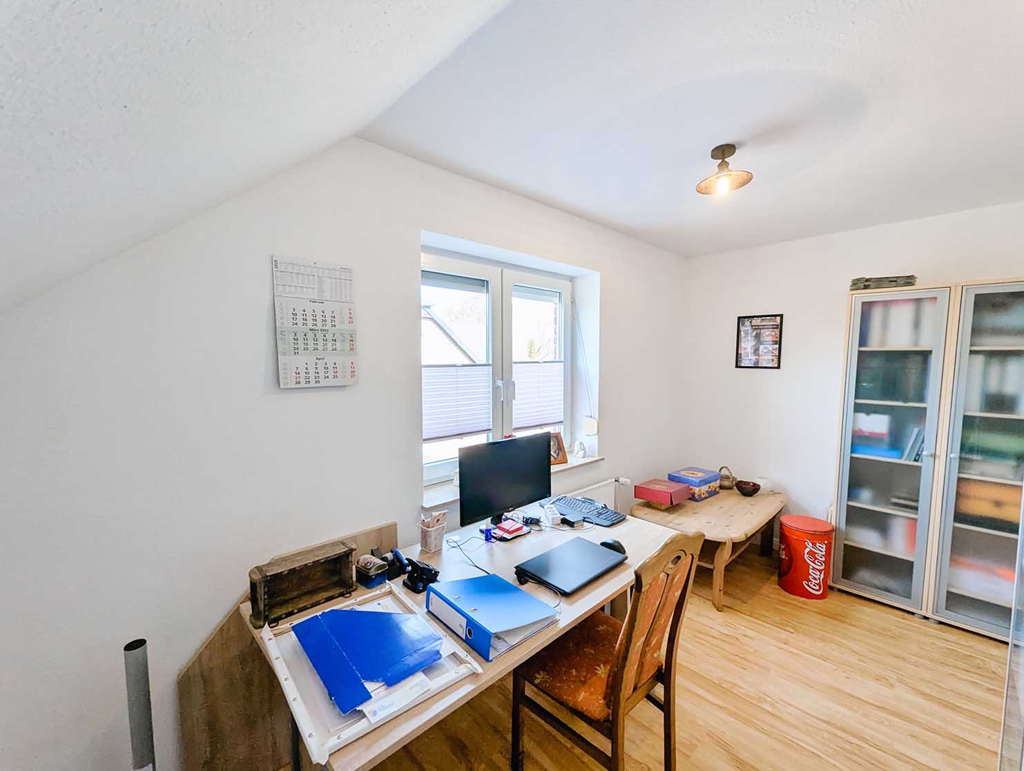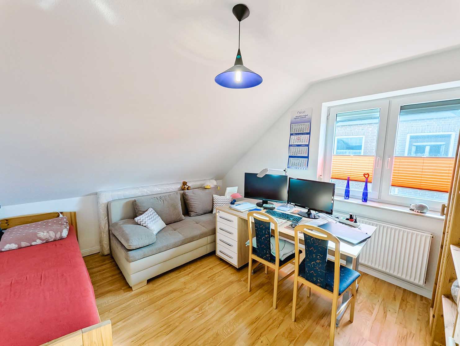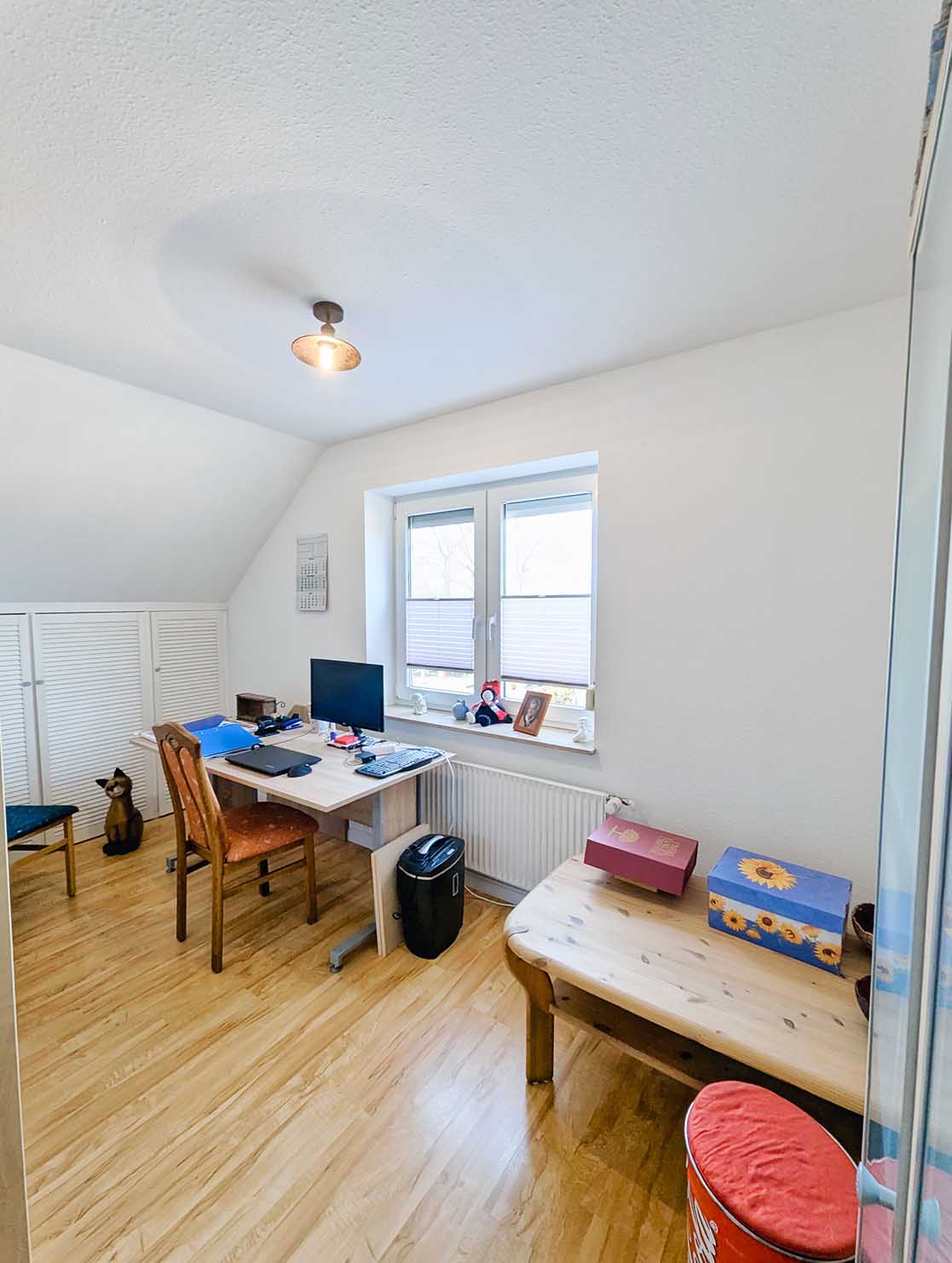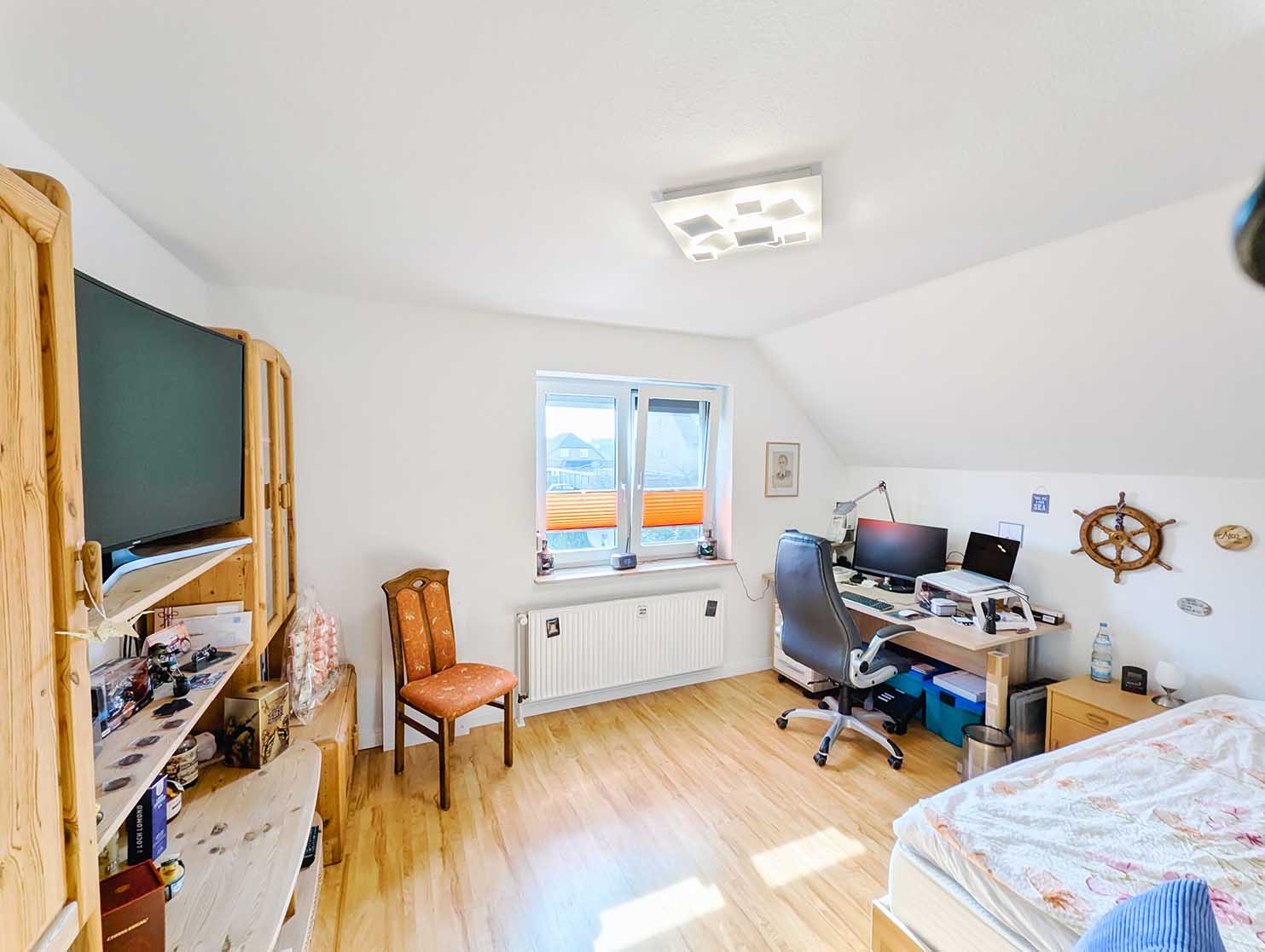 Vom Windfang führt eine Treppe in das Obergeschoss. Hier befinden sich fünf weitere Wohnräume, die vielseitig als Schlaf-, Kinder-, Arbeits-, Ankleide-, Sport- bzw. Gästezimmer genutzt werden können.