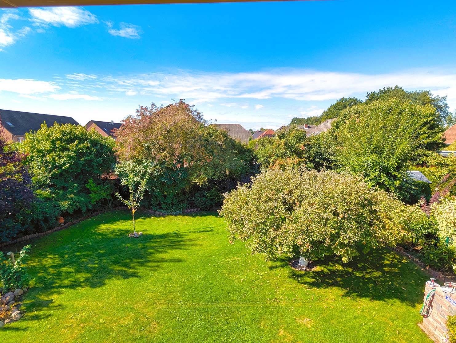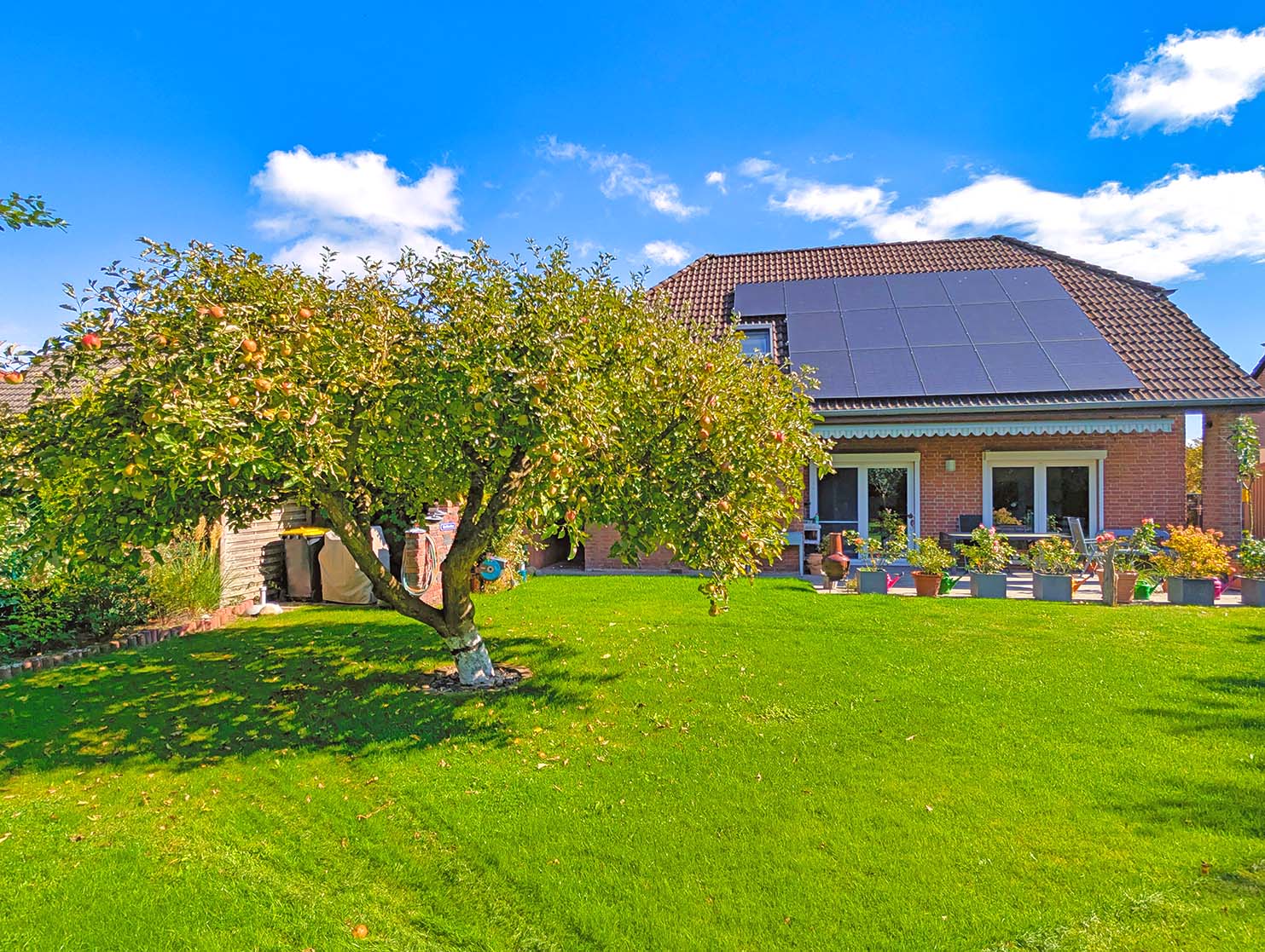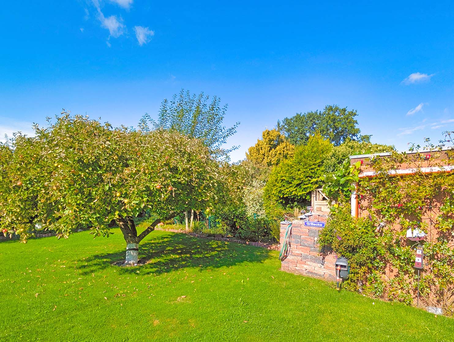Ob auf der Terrasse, unter dem Apfelbaum oder auf der Rasenfläche, hier findet jeder seinen Lieblingsplatz, um sich zu entspannen, zu erholen und die Freizeit mit der Familie und Freunden zu genießen oder den Blick in die Natur schweifen zu lassen. Kindern bietet das Grundstück Platz zum Spielen, Toben, Verstecken und Erkunden.